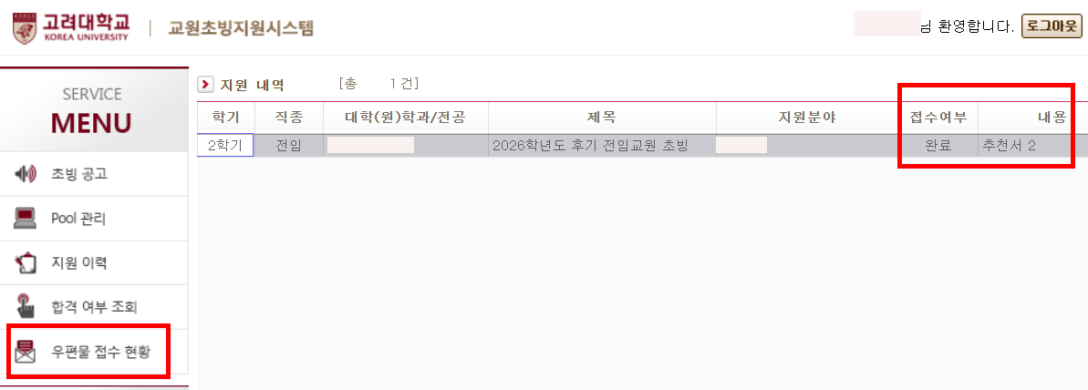 2026학녀도 후기 전임교원 공개초빙 2차 심사를 위해 추천서 제출을 요청하신 분들은 아래와 같이 교원초빙지원시스템 - [우편물 접수 현황]에서 추천서 접수 여부 확인하실 수 있습니다. 추천서 접수 여부는 실시간 반영이 아닌 실제 추천서 메일 확인 및 정리 후 순차적으로 반영되는 점 참고바라며, 개별 추천서 수령 여부는 홗인해드리지 않는 점 양해 바랍니다.